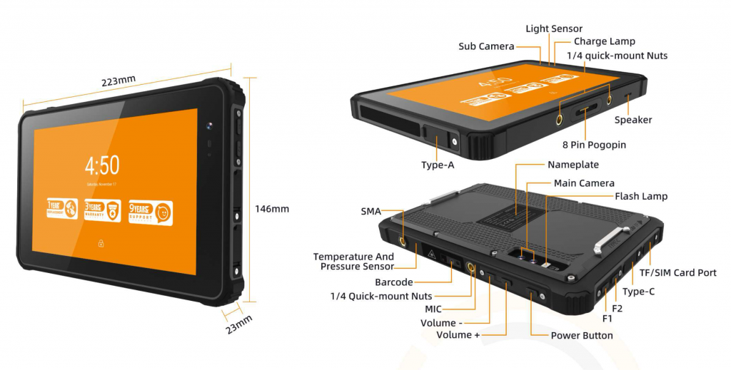H81 (4G-M40) | ARM Cortex A73, 2.1GHz | 6GB | 64GB | 800×1280, 400nits | GPS/Beidou/GLONASS + AGPS/SBAS | Dual-band Wi-Fi | 5.0LE | Android 13 |