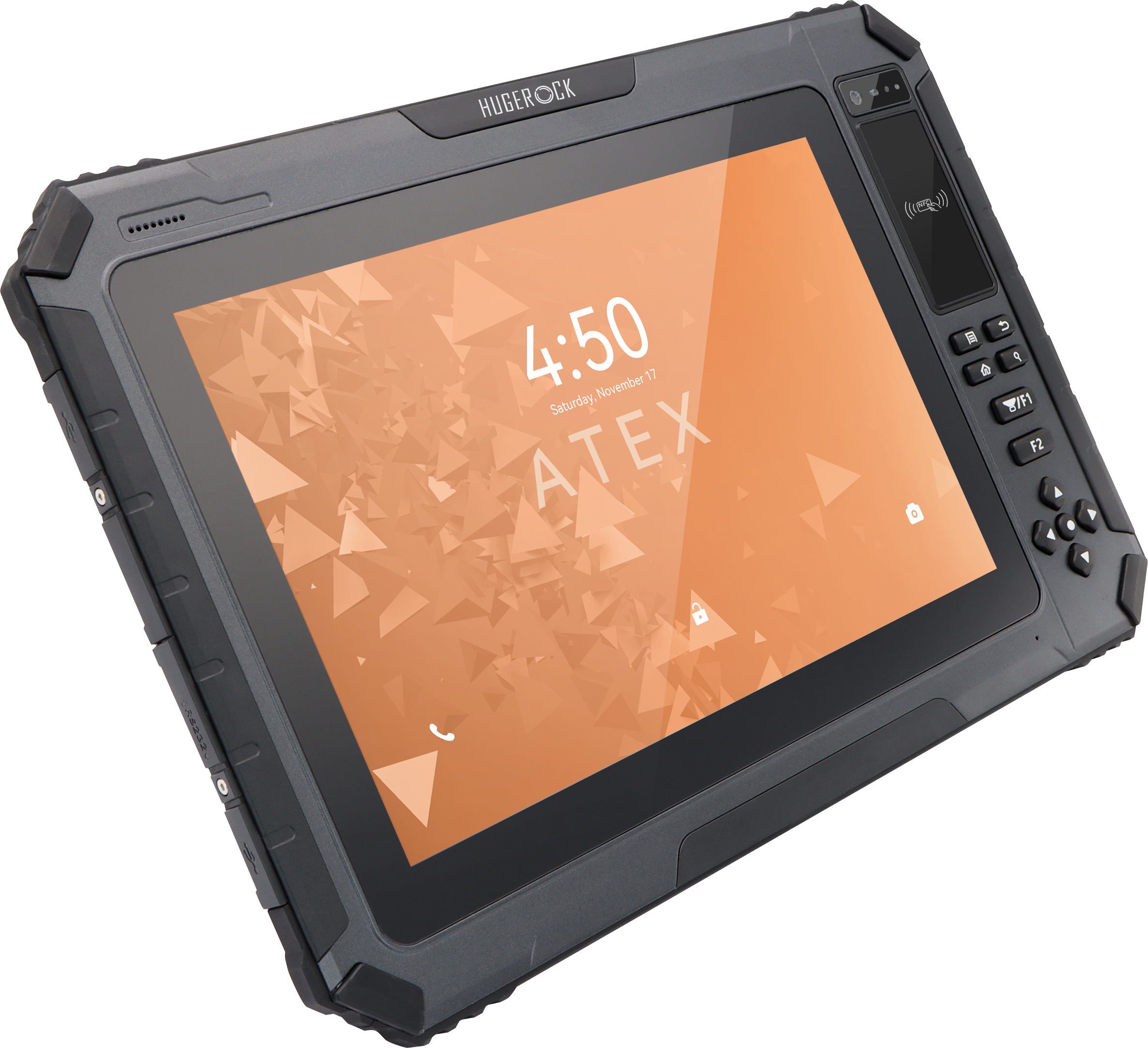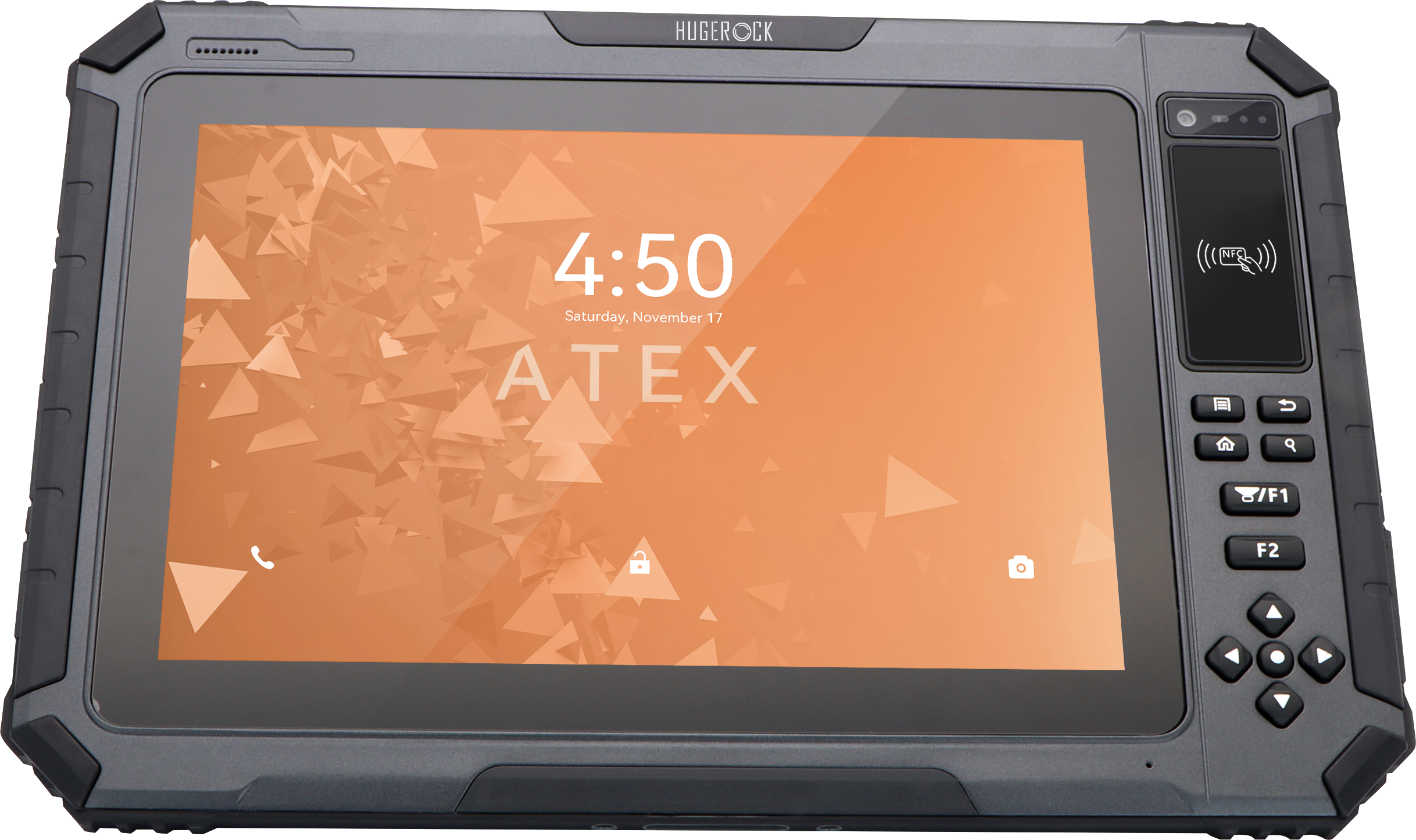 TABLET ATEX HUGEROCK T101EX, una tableta robusta certificada ATEX, es ideal para personal que trabaja en entornos con atmósferas explosivas, como en las industrias de petróleo, petroquímica, minería, militar y departamentos de seguridad pública.
